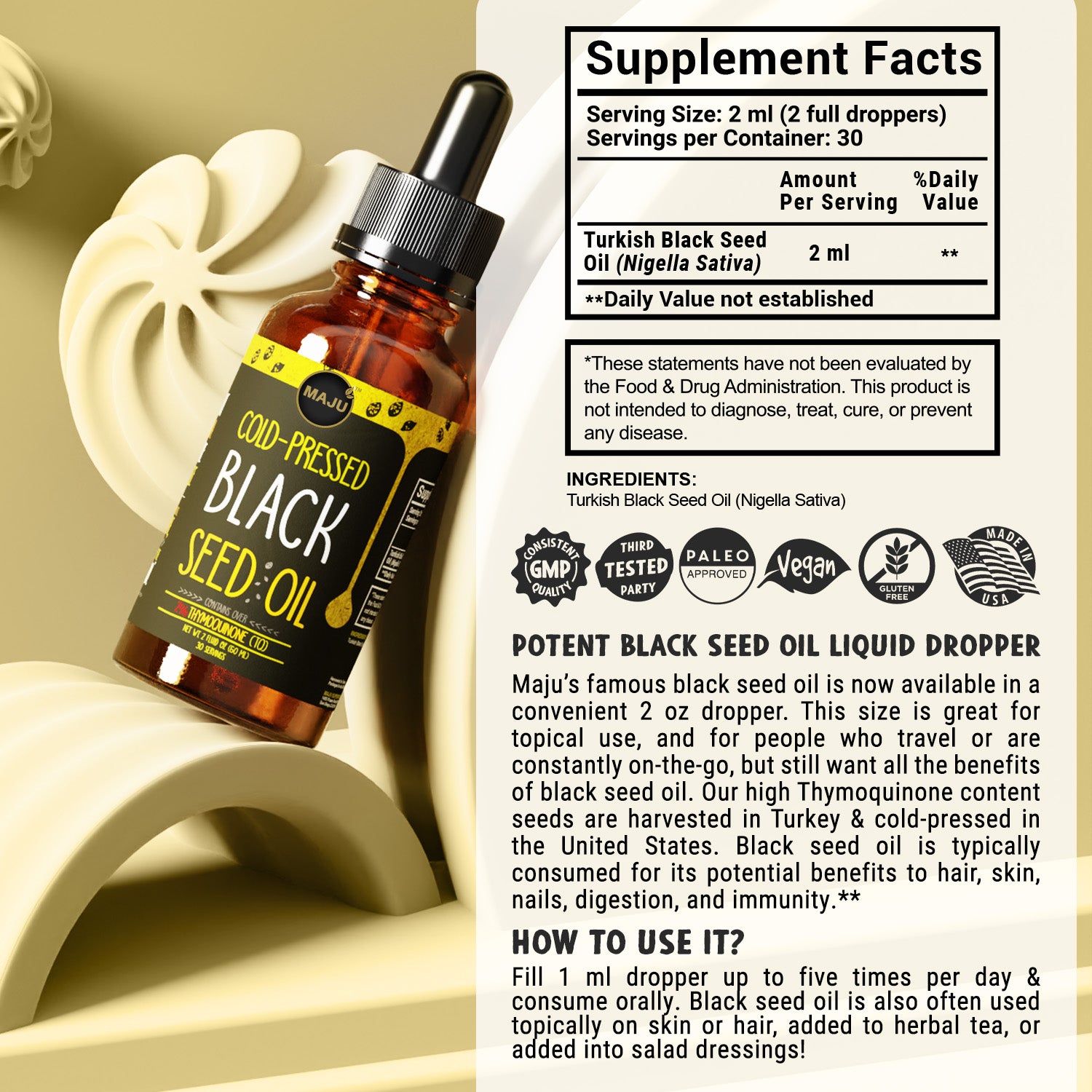 Maju’s Famous Black Seed Oil, now available in a convenient, on-the-go and TSA-approved dropper . Our black seed is grown and harvested from a reputable, family-owned farm in Turkey. This region is known for producing Black Seed Oil that is lighter in taste and color with an even higher concentration of the beneficial compounds such as healthy fats and Thymoquinone. The seeds are slowly cold-pressed, non-GMO, and are 100% pesticide or herbicide free. Stack Maju’s oil up against any USDA organic Black Seed Oil.